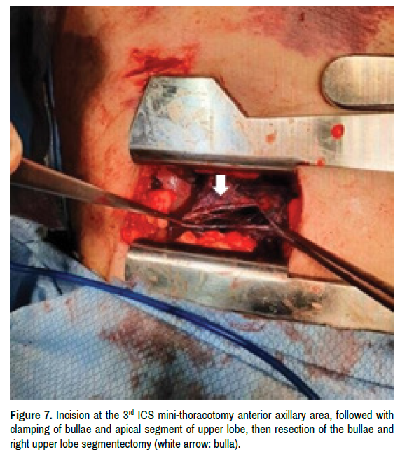He underwent VATS (Video Assisted Thoracic Surgery) with segmentectomy of right upper lobe under general anesthesia. On thoracosospy, a large bullae is seen on the right lung occupying almost half of the right upper lobe (Figure 6). Incision was made at the 3rd ICS, mini thoracotomy on anterior axillary area. Identification and isolation of bullae formations was done. This was followed with resection of the bullae and segment of the right upper lobe (Figure 7). After resection, checking of air leaks was done. Nevertheless, remaining lung segments were adequately expanding. On the opposite side, left lung remain untouched with giant bullae intact.