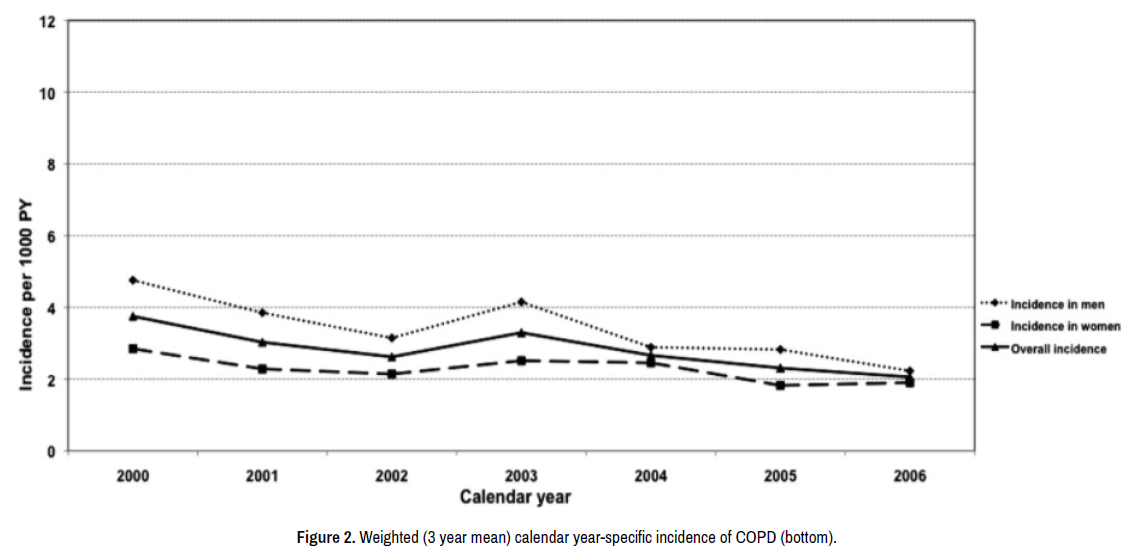 Figure 2. Weighted (3 year mean) calendar year-specific incidence of COPD (bottom).