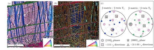 Figure 3. EBSD map with IPF color coding of [a] β-phase and [b] α-phase of the Ti-12Mo STA sample. [c]Stereographic projections of bcc [110] planes and [111] directions, hcp [0001] basal plane and [2110] directions, for two selected β matrix/α precipitates/β twin interfaces. Colors represent the IPF color of the corresponding orientation in the EBSD map. (Reproduced with permission from[23]).