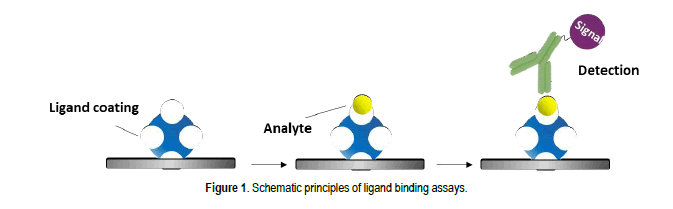 A Ligand binding assay is a common analytical procedure that takes advantage of the highly specific interaction of a ligand and a receptor, an antibody, or another macromolecule (collectively called “affinity recognition reagent”) (Figure 1) [5]. This principle has been widely used for the accurate, precise and sensitive quantification of large molecule analytes for PK assessment from drug discovery to preclinical and clinical phases [6]. In LBA, the analytes are detected through the formation of the ligand-receptor complexes. The sensitivity and specificity of the assay depend highly on the affinity between the two binding partners and on the specificity of their interaction. The parameters of the assay also need to take into account the inherent properties of these molecules such as their stability, sensitivity to pH or temperature and accessibility of their binding sites.LBA assays are designed to reach and maintain the equilibrium constant of the reactants in order to provide suitable assay performance in terms of assay sensitivity, accuracy, and reproducibility. Based on the method of detection, LBAs can be categorized into optical density-, fluorescence-, and luminescencebased approaches. The Enzyme-Linked Immunosorbent Assay (ELISA), Meso Scale Discovery (MSD), Gyro and Luminex are popular LBA platforms for PK assay development [7-9].
