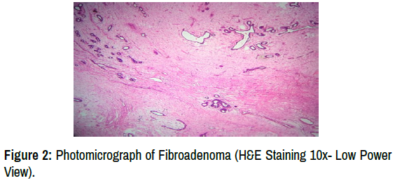The present study showed that majority of non-neoplastic cases were in the 3rd decade followed by 2nd decade. Malignant lesions were common after 5th decade. Among the benign lesions, Fibroadenoma (32.8%) was the commonest benign breast lesion, which is comparable with previous studies by Tiwari et al as 39.6% [2,3]. (Figures 3 and 4)