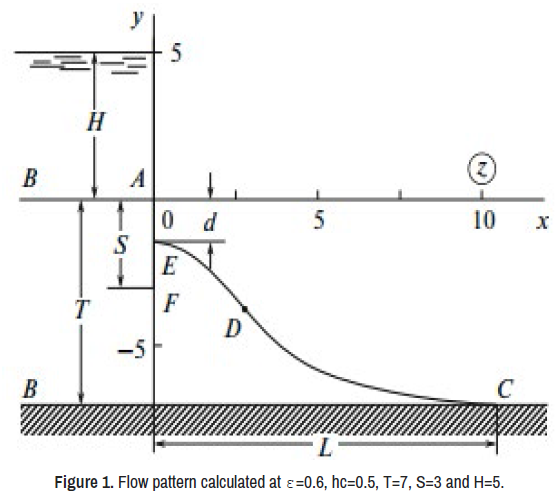 In Figure 1, we show the flow pattern calculated at ε=0.6, hc=0.5, T=7, S=3 and H=5. The results of calculations of the effect of determining physical parameters ε, hc, T, S and Н on the sizes of d and L are listed in Table 1. The analysis of the calculations and data in Table 1 allows us to make the following conclusions: