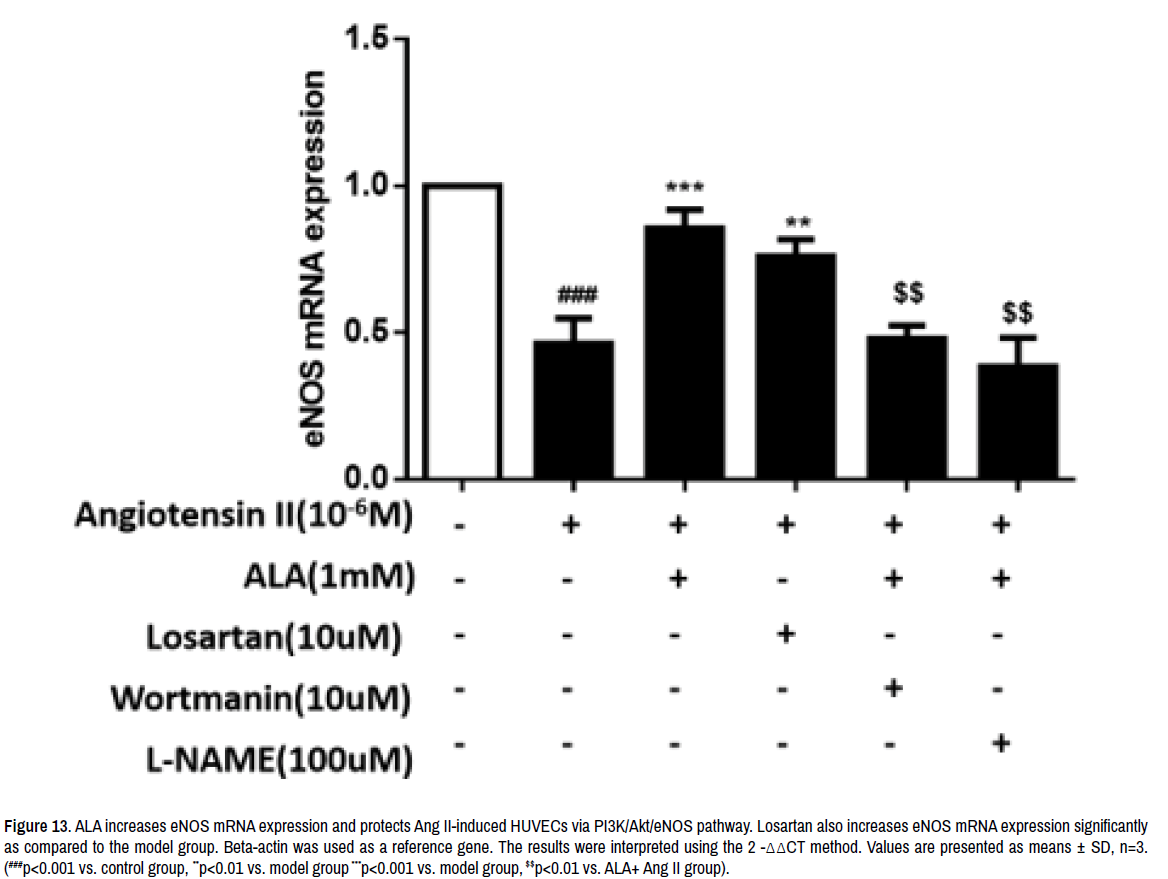 Figure 13. ALA increases eNOS mRNA expression and protects Ang II-induced HUVECs via PI3K/Akt/eNOS pathway. Losartan also increases eNOS mRNA expression significantly as compared to the model group. Beta-actin was used as a reference gene. The results were interpreted using the 2 -ΔΔCT method. Values are presented as means ± SD, n=3. (###p<0.001 vs. control group, **p<0.01 vs. model group ***p<0.001 vs. model group, $$p<0.01 vs. ALA+ Ang II group).
