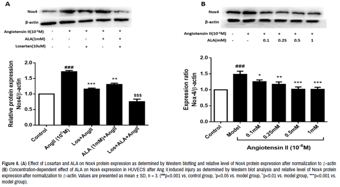 Figure 8. (A) Effect of Losartan and ALA on Nox4 protein expression as determined by Western blotting and relative level of Nox4 protein expression after normalization to β-actin (B) Concentration-dependent effect of ALA on Nox4 expression in HUVECS after Ang II-induced injury as determined by Western blot analysis and relative level of Nox4 protein expression after normalization to β-actin. Values are presented as mean ± SD, n = 3. (###p<0.001 vs. control group, *p<0.05 vs. model group, **p<0.01 vs. model group, ***p<0.001 vs. model group).