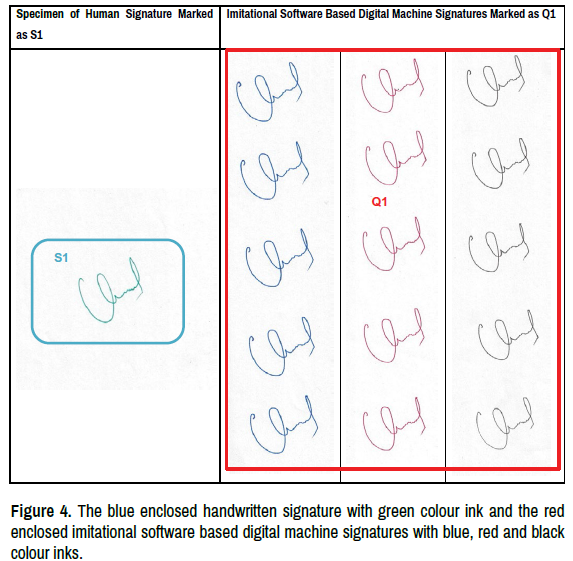 We as questioned document scientists should be aware of machine writing to recognize the trace characteristics of the imitated writing and signatures produced by the imitational software based digital writing machine/ the ‘CNC machine with XY plotter’. The blue enclosed specimen of human handwritings and signatures which are marked as S1 to S3 are freely written having smooth strokes. The imitational software based digital machine questioned writings and signatures marked as Q1 to Q3 appear being slowly written and drawn in the execution with a lack of natural variations in comparison to that of the specimen of human handwritings and signatures marked as S1 to S3. Whereas genuine handwritings and signatures show normal consistency, natural variations, smooth line quality, rhythm, skill, no hesitations, fine commencement and terminal strokes and pressure gradient i.e., uneven pressure at the strokes, emphasis etc. which are acts of genuineness. Handwriting is the most inimitable habit which is developed with lots of effort, practice and then to create mature writings or master pattern and reflects the dynamic characteristic of genuine human handwriting.