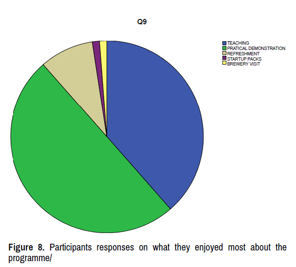 A question was put to participants on the aspects of the programme they enjoyed most. The results show that the majority of the participants enjoyed the practical/demonstrations 50%, while 30.6% enjoyed the practical, surprisingly, Brewery visit had the lowest percent 1.2%. This is despite the enthusiasm expressed over the visit by the participants Figure 8.