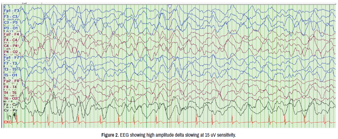Electroencephalogram showed bursts of high amplitude slow and sharp waves occurring at intervals of 2-6 seconds (Figure 1). In view of these bursts of high amplitude sharp waves SSPE was considered and benzodiazepenes provocation was done. These bursts did not have a periodic pattern after benzodiazepine administration. Neuroimaging (MRI Brain) was normal. Lumbar puncture was done and CSF analysis revealed total count -0 cells/ cu.mm, nil RBC'S, sugar -57mg/dl against blood sugar-120 mg/dl, protein 17 mg/dl, Serum and CSF anti measles IgG antibody was negative. Serum ceruloplasmin was normal -24 mg/dl. Serum autoimmune encephalitis panel was performed and tested positive for CASPR2 (Contactin - associated protein 2/VGKC associated) (Figure 2) and negative for NMDA, AMPA-1 and AMPA-2. As CASPR2 antibodies are associated with neuromyotonia, a nerve conduction study and Electromyography were performed that revealed a normal pattern and Whole body Positron Emission tomography (PET) to look for malignancies was normal. He was pulsed with intravenous methylprednisolone for 3 days followed by oral steroids at 1mg/kg/day and risperidone to control aggressive behaviour. After 4 weeks of starting steroids there is a remarkable improvement in speech (10-20 meaningful words) and well-regulated sleep.