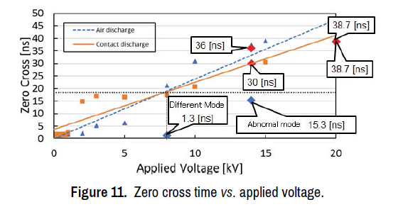 Figure 11 shows the result of the applied voltage dependence of zero cross time. The solid line is for contact discharge, and the dotted line is for air discharge. It was found that the zero cross time increases as the applied voltage increases in both the contact discharge and the air discharge. In addition, 6 points that corresponded to the malfunction and the waveform were plotted in the figure. The intersection of 8 kV where the malfunction started and the zero crosses time was 18.5 ns. If a waveform with a zero crosses time of 18.5 ns or more is input to the Stud no board, it is considered that a malfunction of the reset mode and stop mode is likely to occur. Therefore, it was found that 67% of the malfunctioning waveforms had a zero cross time of more than 18.5 ns.
