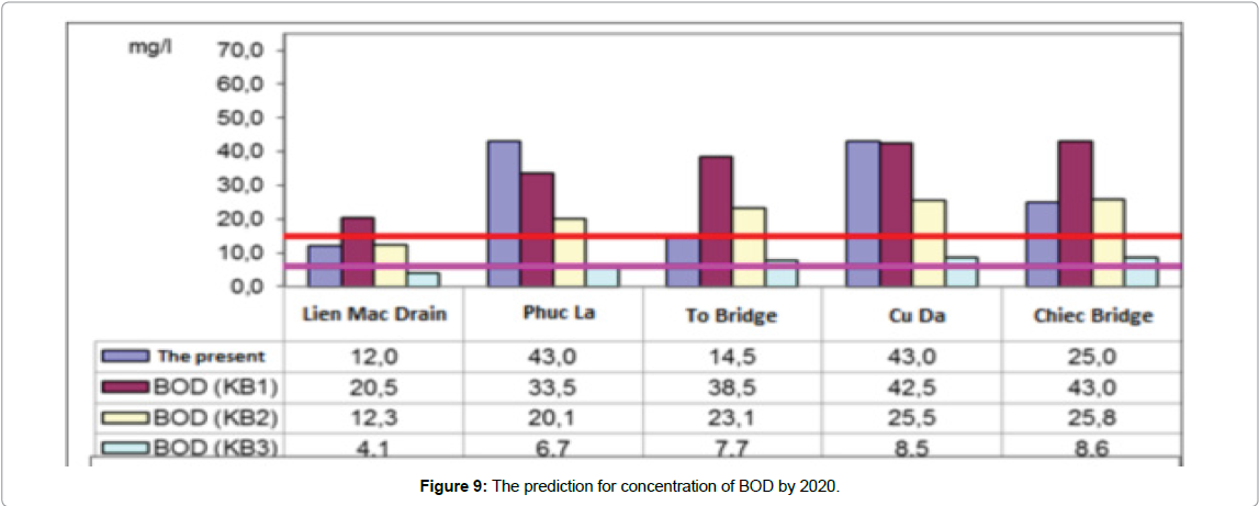b) The prediction for concentration of BOD in Nhue River (from Lien Mac Drain to Chiec Bridge) by 2020: The concentration of BOD in 2020 at Phuc La, To Bridge, Cu Da and Chiec Bridge were predicted to be exceeded the regulated figure for QCVN 08/2008. The Figure 9 also will be insignificantly different from the figure for the observation time. To improve Nhue River water quality and avoid heavier pollution in the future, people should start actively treating the waste water before discharging.