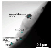 The original ceramic nanoparticles are poorly wetted by the melts, as a result of which they are poorly absorbed by them and cannot be effective centers of crystallization. Therefore, their surface must be clad with metals. Cladding of nanoparticles can be carried out in various ways: mechanically in centrifugal planetary mills, by extrusion through a die in a metal shell in the form of a rod, by ultrasonic treatment in molten salts, using SHS methods (self-propagating high temperature synthesis), by plasma chemical treatment, by rolling in the form of flux-cored tape [14,43,61-66]. In all these methods, a cladding metal powder or a mixture of powders (nickel, iron, chromium, etc.) is added to the ceramic powder. The SEM image in Figure 1 shows a nanocomposition based on SiC nanoparticles clad with micro Al and Cu particles. A planetary mill was used [34].