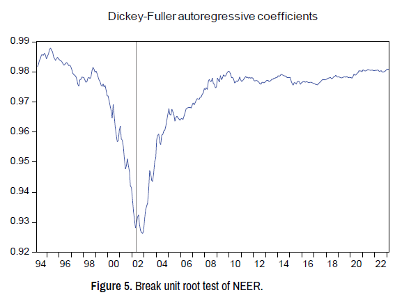 In the Figure 5, the break unit root test of NEER of Euro has been depicted under ADF auto-regressive coefficient (Figure 5).