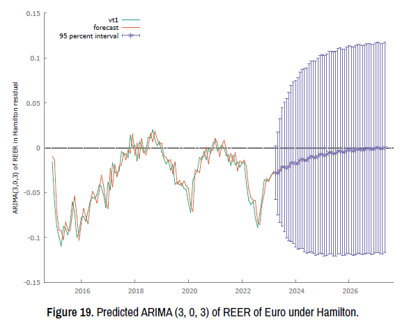 If the ARIMA (3, 0, 3) of REER of euro under Hamilton decomposition residual conditions has been predicted for 2027m05, then the model distinctly converges towards equilibrium insignificantly with fluctuations which is clearly depicted in Figure 19.