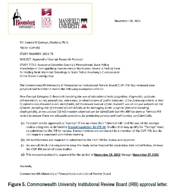The Commonwealth University Institutional Board Review (IRB) for the Protection of Human Subjects Study Number: 2022-75: The IRB reviews research involving human subjects to ensure that subjects are not placed at undue risk and that they give uncoerced, informed consent to participate in the research. This research protocol was approved for the period of November 28, 2022, through November 27, 2023, under Exempt Category 2: research involving the use of educational tests, and the information obtained is not identifiable and does not put subjects at risk (Figure 5).