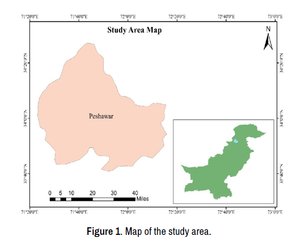 Geographical location is between lengths 71°22' 0" -71º 42' 0" East and latitudes |33° 44' 0" – 34º 15' 0" North. It is the headquarter of Khyber Pakhtunkhwa province. The Peshawar area is 1.257 square kilometers and about 358 m above sea level. The district has extreme climatic conditions. The average monthly temperature for the Peshawar district varies from at least 2.60ºC in January up to 42.70ºC in June (Ullah & Khan, 2019). The average Relative humidity varies from 46 to 76 correspondingly in June and August [13-17] (Figure 1).