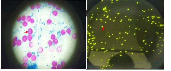 On Modified acid fast stain the oocysts of Isospora were observed to be ellipsoidal in shape around 23-33 ÃÂ?¼m ÃÂ?? 12-15 ÃÂ?¼m in size with a pink stain. The sporoblast and oocyst wall were also stained. With Auramine stain they showed intense bright yellow fluorescence. (Figure 3). These oocysts were also observed in direct wet mount. The preparation time of Kinyounâ??s acid-fast stain in our laboratory was about 20 minutes and required an additional 5 minutes for screening the slide. The auramine- stain preparation required 17 minutes, while Screening and Interpretation of the fluorescent smears required less than a minute per slide.