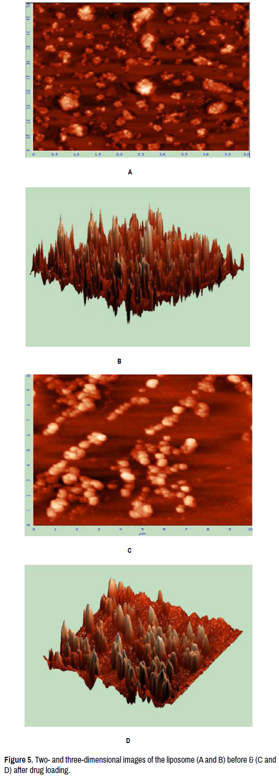 Figures 4a and 4b show the DLS diagram of LECFB@AuNPs liposome with a size of around 240.9 nm, while the size of synthesized LECFB is 142.3 nm. Furthermore, Figures 5a and 5b are related to the two- and threedimensional images of the distribution of the liposome nanocarrier before the drug loading, respectively. The agglomeration of the particles can be seen in the related figure, but this effect was highly eliminated due to the exact numerical calculations of the software, and the results are close to reality. It is also important to be noted that despite the agglomeration of the particles, it is possible to see the particles separately. Figures 5c and 5d are related to the two- and three-dimensional images of the distribution of liposome nanocarrier after the drug loading, respectively. As expected, the size of the liposome increases after the drug loading.