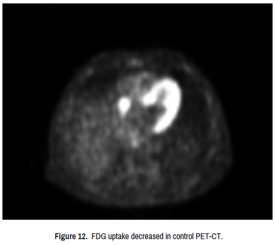 In the immunohistochemical and histopathological study, synaptophysin (+), pancytokeratin (+), chromogranin (+), TTF-1 (-). Ki-67 score was found to be 80-90%. The biopsy revealed small-cell lung carcinoma, and it was considered that primary focus was in the lung with direct invasion to the heart. As a result patient was diagnosed stage 4 lung carcinoma and consulted to oncology and referred to relevant department. The patient was started on combined radiotherapy and etoposide, cisplatin as a chemotherapy regimen. After 3 months of chemotherapy treatment, the patient underwent control PET-CT and transthoracic echocardiography in response to the treatment. The examinations showed that the tumor size decreased and the patient responded to the treatment. It was observed that the tumor size decreased. Transthoracic echocardiography showed that the size of the mass decreased to 31mm × 29mm. It was observed that FDG uptake decreased in control PETCT (Figures 9-12).