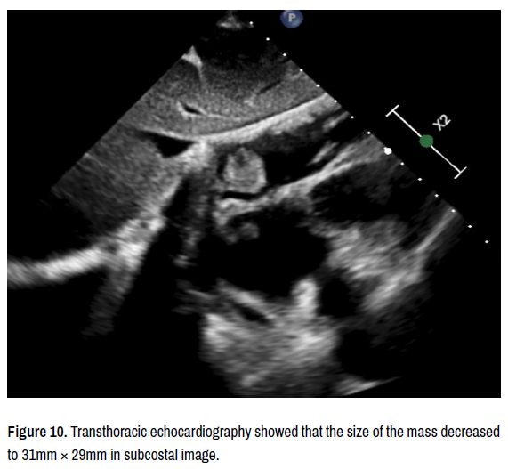 Figure 9. Transthoracic echocardiography showed that the size of the mass decreased to 31mm × 29mm.