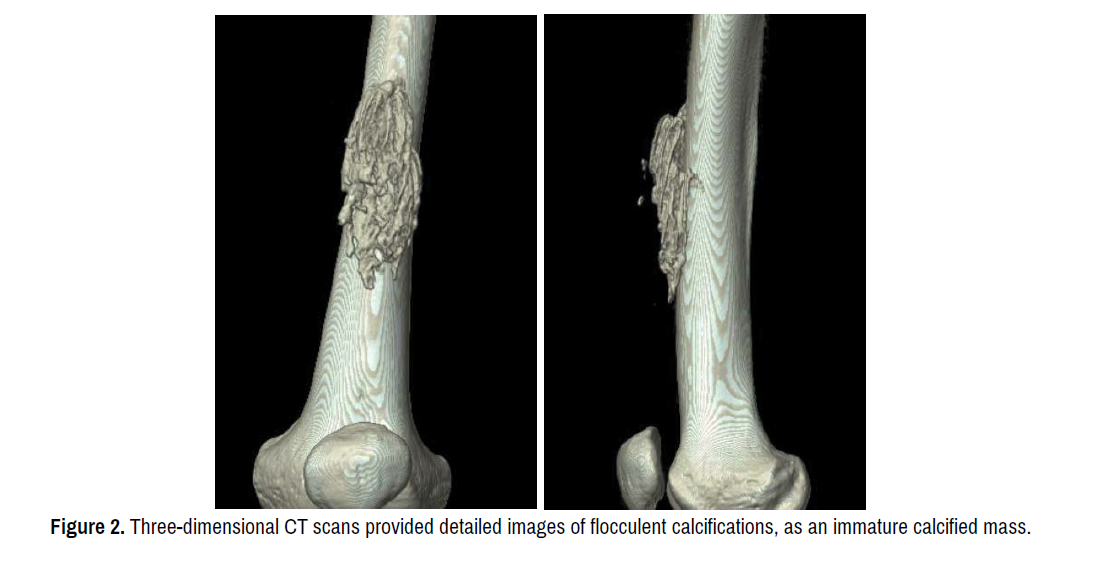 A radiograph showed a lacy pattern of new bone formation with a central zone of uneven density adjacent to the anterior aspect of the left femur at 4 weeks after the initial trauma (Figure 1A). Computed tomographic (CT) scans also showed several calcific deposits arranged in rami, indicating MO (Figure 1B). Three-dimensional CT scans provided detailed images of flocculent calcifications, as an immature calcified mass (Figure 2). Magnet resonance imaging scans revealed no internal derangement of the left joint. From these observations, the injury was diagnosed as benign heterotopic bone, MO.