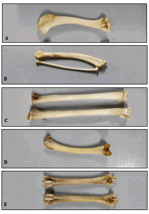 Figure 1. Selected long bones (A) Humerus, (B) Radius and Ulna, (C) Tibia, (D) Femur and (E) Metatarsals for osteometric measurements.