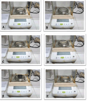 Figure 4. Measurement of weight of (A) Humerus, (B) Radius, (C) Ulna, (D) Femur, (E) Tibia (F) Metatarsals using digital weighing balance.