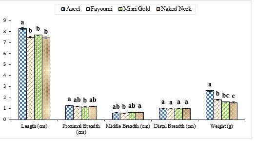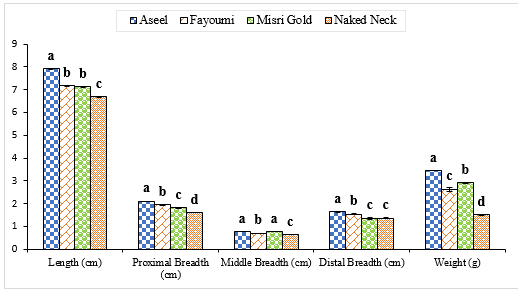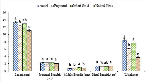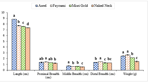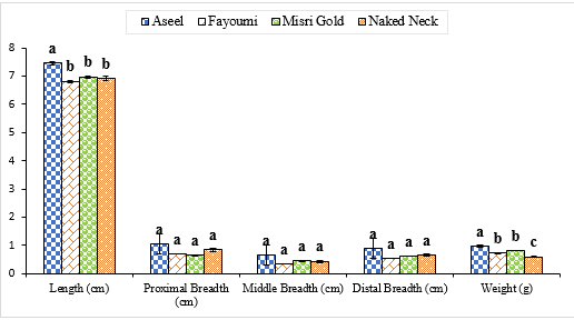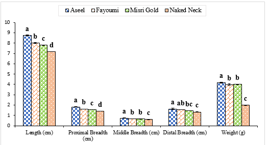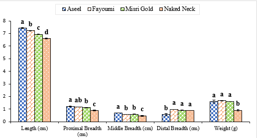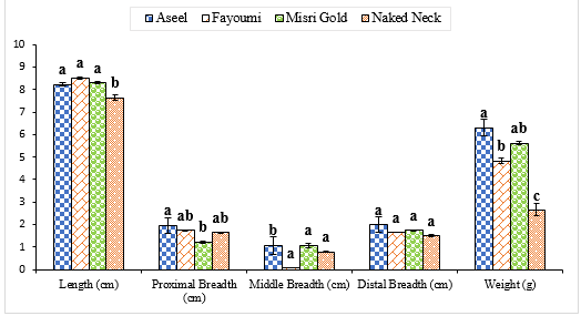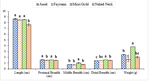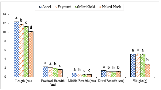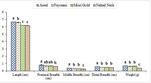 | Distal width | cm | 1.34 ± 0.01b | 1.44 ± 0.001a | 1.27 ± 0.03c | 1.28 ± 0.01bc |