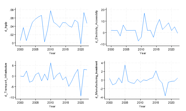 Upon differencing they attained stationarity property. This is indicated by its p-values which were less than 5 percent, this implies rejection of the null hypothesis of unit root and hence, I (1). If variables have unit roots, they are differenced to any order. In this study, all the non-stationary variables become stationary after first difference. Figure 1 provides graphical representation of data at levels. Figure 2 represents trends after first difference (they are stationary). Identifying unit roots and addressing non-stationarity is vital for reliable economic modeling. For instance, in analyzing the impact of electricity accessibility, manufacturing and infrastructural development on economic growth, ensuring that the data series used are stationary can lead to more accurate and meaningful results.