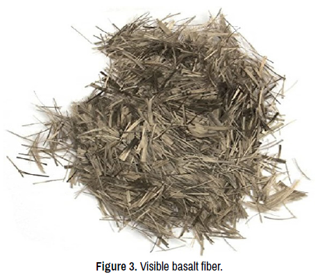 Basalt fiber: Chemically speaking, basalt is abundant in silicon, iron, magnesium, calcium, sodium, and potassium oxides, as well as traces of alumina. The total percentage distribution of basalt's chemical makeup Geographical distribution affects the chemical composition. Basalt makes up to 33% of the earth's crust, hence it is abundant. Basalt powder is ground into a fine powder and heated to a glassy molten state between 1500 and 1700°C to create basalt fibers, which are subsequently extruded into thin threads. Basalt fiber is visible in (Figure 3).