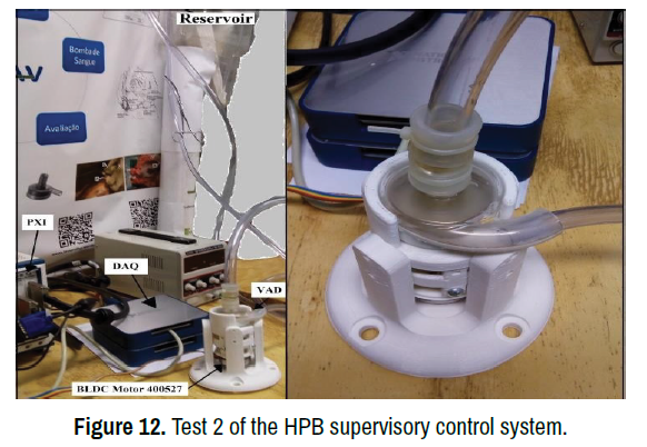 Test 2 was performed to evaluate the stable maintenance of the motor speed in the presence of pumping resistance variations caused by the physiological system. For this the speed was adjusted increasing with 1000 rpm step (1000 - 4000 rpm) and decreasing with 1000 rpm step (4000 - 1000 rpm) in the HPB supervisory control system and the response of the motor without load and with load was examined by means of contact tachometer. Further, the response of the control in the presence of disturbance (inducing a load on the motor) and noise (proximity to electromagnetic devices) will be checked. This test was performed using the definitive actuator of HPB.