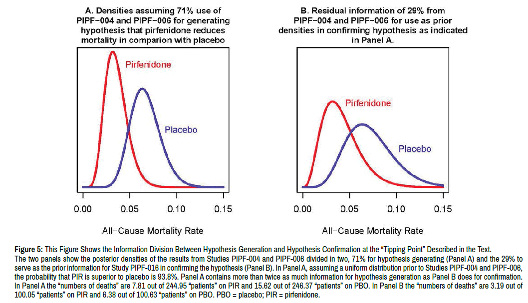 Figure 4 shows this division into hypothesis generating and confirmation. The former is shown in Panel A, showing 50% of the information in Studies PIPF-004 and PIPF-006. In Figure 4A the probability that pirfenidone is superior to placebo is 91%, which provides substantial motivation to establish the hypothesis that pirfenidone reduces all-cause mortality. For the prior distribution in Panel B for assessing all-cause mortality in Study PIPF-016 the posterior probability of superiority calculated in Figure 2 is 98.4%. The corresponding calculation for treatment-emergent IPF-related mortality in Figure 3 again assuming 50% use of results from Studies PIPF- 004 and PIPF-006 is also 98.4%. The analogous two-sided p-value is 0.032. In both cases the results provide ample evidence of confirmation.