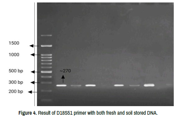 Both the fresh and stored DNA was performed in PCR with both the primers vWA and D18S51. Here D18S51 had having greater amplicon size with 290- 310 bp than vWA which one 140-180 bp amplicon size. After the successful amplification of the primers with fresh and soil stored samples agarose gel electrophoresis was performed for both the primers separately [13].
