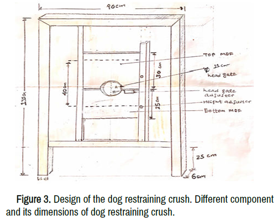 Movable dog restraining crush is a strongly built stall for holding dogs safely while they are examined, vaccinated, marked, or given veterinary treatment. The great advantage of this restraint tool is that a dog in the crush cannot see the procedures performed on it and stays calm. In addition, having the dogs calmly held will have a positive impact on the outcome of clinical examination, vaccination or parameter measurement as it avoids physiological changes that result from stressed dogs trying to escape or adjust their positions. Dog restraining crush is made from wood, Medium Density Fiberboard (MDF), cola, nail and a piece of sponge wrapped with leather or cloth. The front end has head gate between two MDF boards to catch. A circumference of head gate is rimed with sponge wrapped by leather or cloth to avoid dog neck injury. The crush has a manual operating mechanism from the side to widen head gate by raising the top MDF board up for a dog to enter its neck through head gate, and then let down the top MDF board. Both the head gate and the height of crush are also adjustable at 3 cm interval to accommodate dogs of different sizes (Figure 3). Moreover, it is portable for field use as well as potentially designed to be fixed and stay in one place [5].
