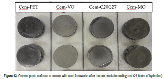 Pre-crack demolding test: As previously indicated that the effect of formwork type on the adhesion/demolding force between cement paste and formwork was investigated by a pre-crack demolding test. The results tabulated in Table 10 reveal that Cem-Ref had the highest demolding force (121 ± 17.2N) among other types of formworks. It indicates that Cem-Ref had a 30% higher demolding force compared to Cem-C20C27 and 4 times higher than Cem- MO. Besides, the lowest adhesion force was obtained for the cement paste samples subjected to vegetable oil and PET-coated formworks. However, the demolding force for the Cem-VO and Cem-PET samples was too low to be recorded by the apparatus (<10 N).