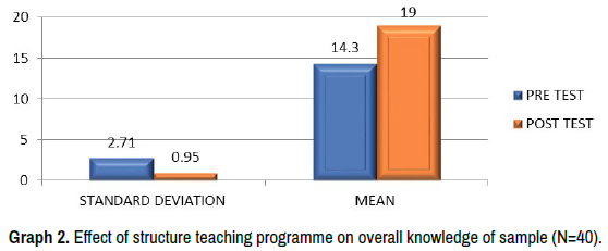 Graph 2 and Table 2 display the comparison of overall pre and post-test knowledge score regarding topic.