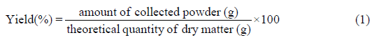 Spray drying: Spray Drying (SD) was performed using a BUCHI Mini Spray Dryer B-191 (Flawil, Switzerland); this is a co-current drying system comprising a two-fluid nozzle mechanism. The nozzle size was 0.8 μm. All wine lees suspensions were diluted to 5% (w/w) to prevent clogging of the nozzle. Spray drying was performed at three different inlet temperatures (120°C, 160°C and 200°C) in order to study the influence of the drying temperature on the antioxidant properties of spray-dried wine lees. The following operating parameters were set for all the SD batches: pump rate (8 mL.min-1), spray gas flow rate (50 mmHg, 700 m3.h-1) and the aspiration were maintained at 100%. Outlet temperatures were recorded for every batch and were 65, 95 and 130°C for inlet temperatures of 120, 160 and 200°C respectively. All SD powders were subsequently collected in a glovebox under dry air and hermetically stored in glass vials before analysis.