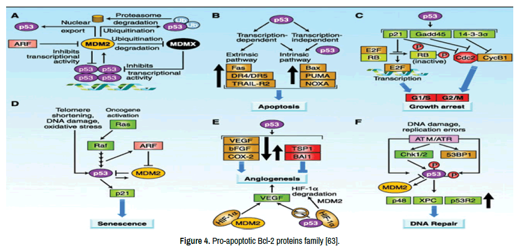 Figure 3. Different signaling pathways of p53. A. Transcription factor, B. Apoptosis, C. Cell growth arrest, D. Senescence,E. Angiogenesis, F. DNA damages repair [38].