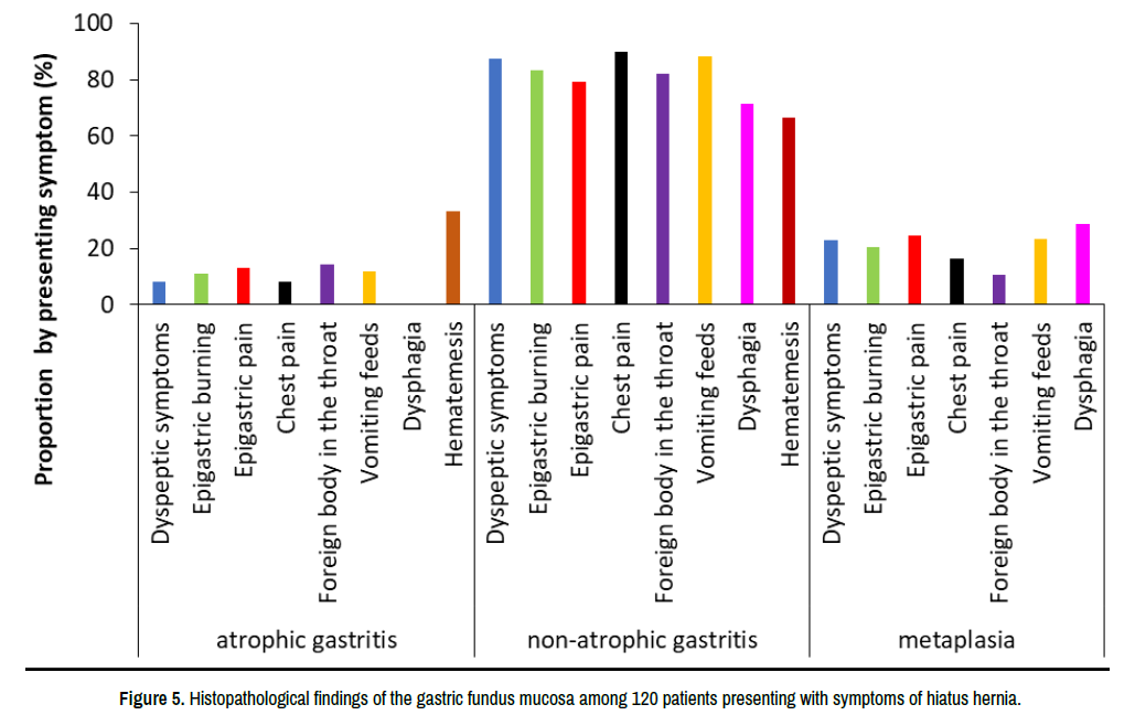 None of the patients had normal histopathological findings of the fundus mucosa. Out of the 120 examined, 11 (9%) had atrophic gastritis; 103 (86%) had non-atrophic gastritis; 24 (20%) had Gastric Intestinal metaplasia; 5 (4%) had both atrophic gastritis and intestinal metaplasia while 14 (12%) had both non-atrophic gastritis and Gastric intestinal metaplasia (Figure 3). There was no significant relationship between medical history and histopathological findings; all patients had abnormal histopathological findings of the fundus. More than half of the participants presenting with symptoms of hiatus hernia including: epigastric burning (87%), epigastric pain (91%), chest pain (92%), dyspeptic symptoms (94%), sensation of foreign body in throat (93%), vomiting feeds (94%), dysphagia (100%) had mucosal hyperemia on endoscopy (Figure 4). More than half of the participants presenting with symptoms of hiatus hernia including: epigastric burning (83%), epigastric pain (79%), chest pain (90%), dyspeptic symptoms (88%), sensation of foreign body in throat (82%), vomiting feeds (88%), dysphagia (71%), hematemesis (67%) had non-atrophic gastritis (Figure 5).