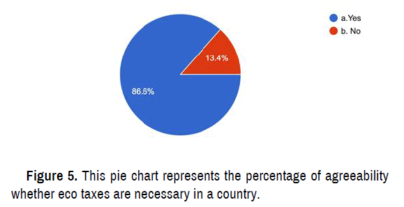 86.57% of the respondents answered “yes” to the necessity of eco taxes in India because the fundamental economic justification for employing taxes in environmental policy is to include the costs of pollution and other environmental expenses, known as externalities, in the pricing of products and services generated by economic activity. These environmental expenses are referred to as ‘externalities' because they are side effects of economic activity and are not included in the prices paid by the companies or consumers directly engaged. 13.43% of the sample population answered “no” to the necessity of eco taxes in India because environmental tax comes with its few cons. For instance, Initial use of energy or water may be tax-free, but later levels of consumption may be subject to progressive taxes. This can reduce the tax's impact on small businesses while boosting the incentive to be more effective with the taxed product [20]. The Dutch energy tax was intended in this manner for both small businesses and families.