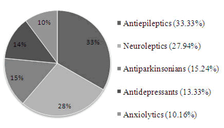 Results: Of the 197 patients studied, whose ages ranged from 3 to 82, the age group under 30 only represents a quarter and the population most exposed to psychological disorders is those between 30 and 60 years old or 57.4%. It is essentially antiepileptics (33.33%) and neuroleptics (27.94%) that are most often prescribed. Nearly 50% of patients take a single medication and only 14.2% take three or more products. 22% of patients have at least one associated pathology.