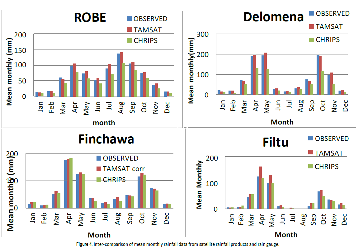 Inter-comparison of mean monthly rainfall data for rainfall estimates. The mean monthly maximum rainfall has the same trend as observed data. The rainfall maximum is in April with a secondary maximum in October for each location and the minimum are in January and July for each location. Compared to rain gauges values, CHRIPS satellite rainfall products underestimated the monthly rainfall in the range 0.84% to 28.5%, While TAMSAT over estimated in the range 0.52% to 30% (Figure 4). Inter-annual variation of rain observed by rain gauges was generally captured by both of satellite rainfall products for all selected stations. The CHRIPS product shows a small underestimation of annual maximum rainfall for the whole study period and all selected station from 39.9 to 6938.8 mm/yr. But shows better performance in capturing inter- annual variation of rainfall. TAMSAT product shows overestimation of annual maximum rainfall from 84.4 to 2054.81mm/yr. for the whole study period when compared with Observed data (Figure 5). In capturing both magnitude and trend of annual rainfall bias corrected TAMSAT shows better performance.