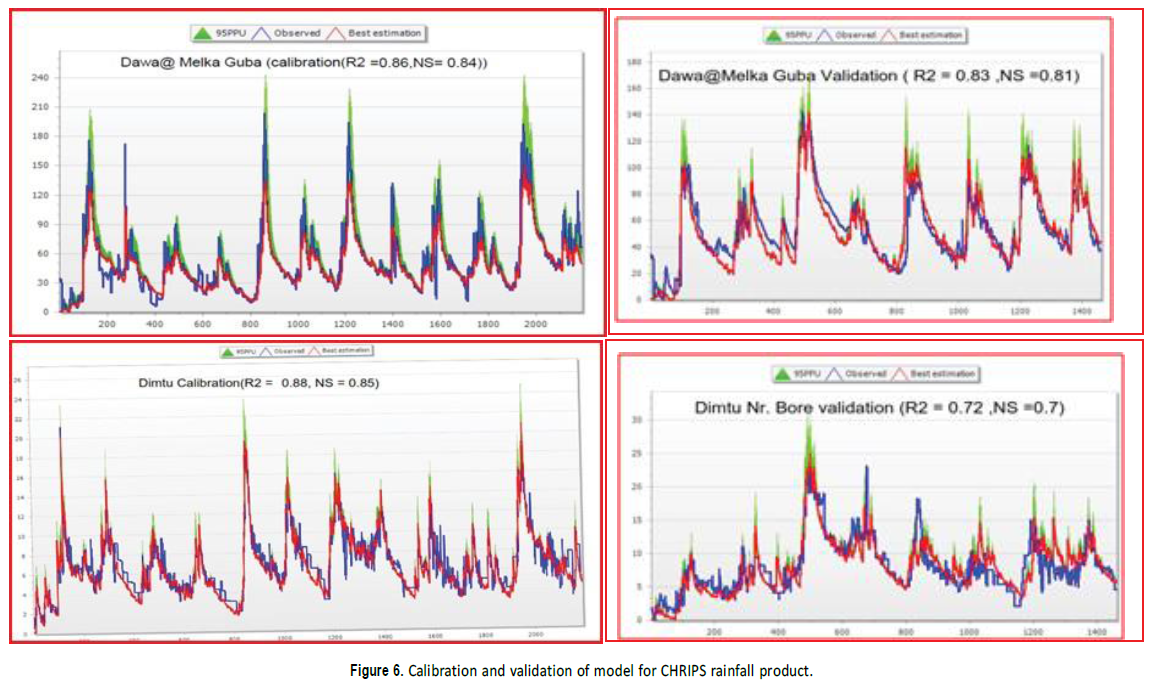 Validation of the model was carried out and the percent of error between the observed and simulated daily flow are (-0.82 - 3)% for CHRIPS and (-14 - 0.3)% for TAMSAT. Thus, it is found within the tolerable range of ±15%. The coefficient of determinations (R2) was found to be (0.72 - 0.93) for CHRIPS and (0.81 -0.87) for TAMSAT respectively and Nash-Sutcliffe simulation efficiency (NSE) was (0.7 - 0.95) for CHRIPS and (0.76 -0.88) for TAMSAT respectively (Figure 7). These shows a very good correlation of the simulation results with the observed values.