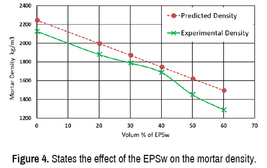 The mortar density decreased when increased the dosage of EPSw within the mix, the reductions in the average density relative to the reference mix were 11.6, 15.8, 20.5, 31.7, and 39.3% for 20% EPSw, 30% EPSw, 40% EPSw, 50% EPSw, and 60% EPS respectively.