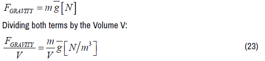 The right and the left term of Newton’s law of motion in equation (5) has to be divided by the Volume “V” to find an equation for the force density F related to the mass density “ρ”.