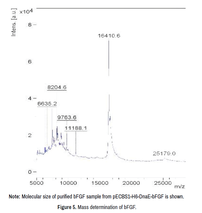 Soluble bFGF retrieved from the lysate was observed to have same molecular weight as of bFGF purchased from Thermo Fisher Scientific in Western blot analysis (Figure 4). Purified bFGF sample was subjected to LC-MS and mass determination by MALDI-TOF. The results confirmed that the final bFGF product obtained from H6-DnaE-bFGF expression construct, possessing the 146 amino acid bioidentical structure (Table 1) and with 16.4 kDa in size (Figure 5).