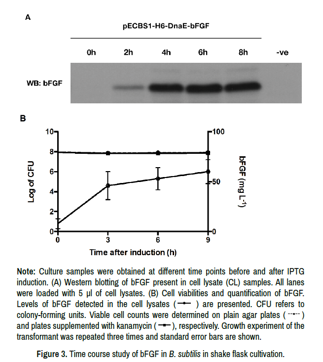 Bacillus subtilis (B. subtilis) is a gram-positive bacterium which is regarded as Generally Recognized As Safe (GRAS) by FDA, as it is free of endotoxins [11]. Despite the expression levels of recombinant heterologous proteins are lower in comparison to E. coli [12], B. subtilis leads to relatively stable expression and the final products are safe to use. In this study, we aimed to exploit intein from DNA polymerase III unit of Anabaena species (Asp DnaE), with the 6x His tag on N-terminus in order to facilitate the intracellular expression of bFGF in B. subtilis. Surprisingly, bFGF was shown to be auto-cleavable during expression. Plasmid stability and cell viability remain maintained in high levels during shake flask cultivation and when the expression is scale-up to 4 L fermentation, no significant changed was found in both parameters while giving a great improvement of yield of bFGF, 113 mgL−1. The study may provide a new option in production of bFGF and for others heterologous proteins by utilizing intracellular intein-mediated approach in Bacillus subtilis.