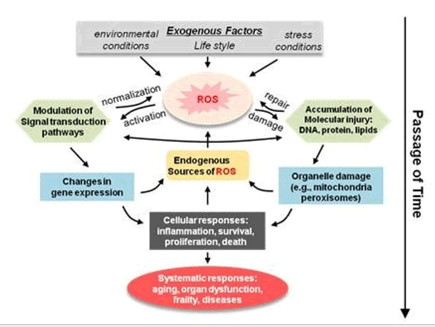 Ageing is a complex process that is manifested within organisms at genetics, molecular, cellular, organ, and system levels. According to the oxidative stress theory, key contributors to the process of aging in cell and tissues are oxidative stress caused by ROS. The induction of oxidative stress by ROS plays a direct or indirect role in many conditions such as vascular disease, neurodegeneration, ischemia, aging, cell death, inflammatory responses, and even cancer (Figuer 2).
