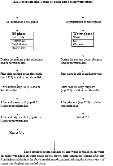 Dye test: A particular type of dye (amaranth dye) was mixed with the cream. A drop of the cream was placed on a microscopic slide then covered with a cover slip and examined under a microscope. Result was noted according to the colour of the dispersed globules and ground.