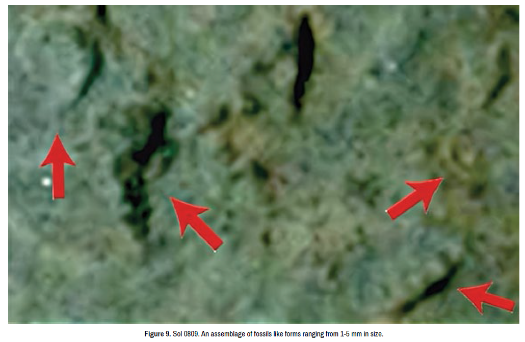 Rizzo V, et al. [2] have published evidence documenting that these lozenge-shaped forms have patterns and shapes are characteristic of biology and not crystals as based on a statistical comparative quantitative microstructural analysis (Figure 38). Specifically, Rizzo V, et al. [2] compared the morphology of these microstructures with the microstructures of stromatolites/ microbialites, microfossils and algae, and microstructures of sulphate crystals (gypsum, jarosite). Morphological analysis of MAHLI images at sols 809 and 889 reveal that the “lozenge-shaped” formations have distinct fusiform/filiform, septate, and curved shapes characteristic of colonies of microorganisms (e.g. terrestrial microalgae, filamentous cyanobacteria, euglenoids). Based on comparative quantitative measures it was determined that these patterns and shapes do not resemble crystal-type organization or structure.