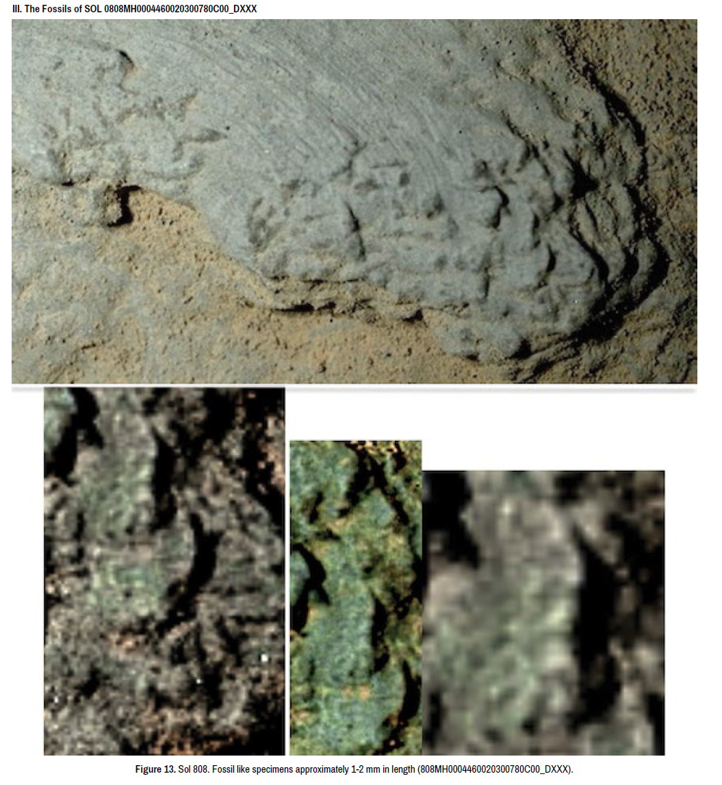 Admittedly, we have not proven these are true fossils. Conversely, consider the alternative: What is the probability that Mars is and was a “lifeless desert” that was and is completely sterile? Given the ability of “life” to adapt and flourish in the most extreme environments including long term direct exposure to space outside the ISS [60,61], coupled with the fact that despite “sterilization” even NASA “clean rooms” and Mars-bound equipment are crawling with bacteria, fungi, and other microorganisms [53], and as there is so much published evidence supportive of current and past life on Mars [1-7,13-21,25,34-36], then the probability of sterility is zero. Certainly it is possible that some of the fossil-like specimens presented here are abiogenic. However, given the lack of abiogenic analogs, whereas so many diverse forms are oriented differently yet remain morphologically similar to each other and to fossilized marine biota of Earth, an abiogenic explanation is unlikely but can’t be ruled out without extraction and detailed microscopic examination.