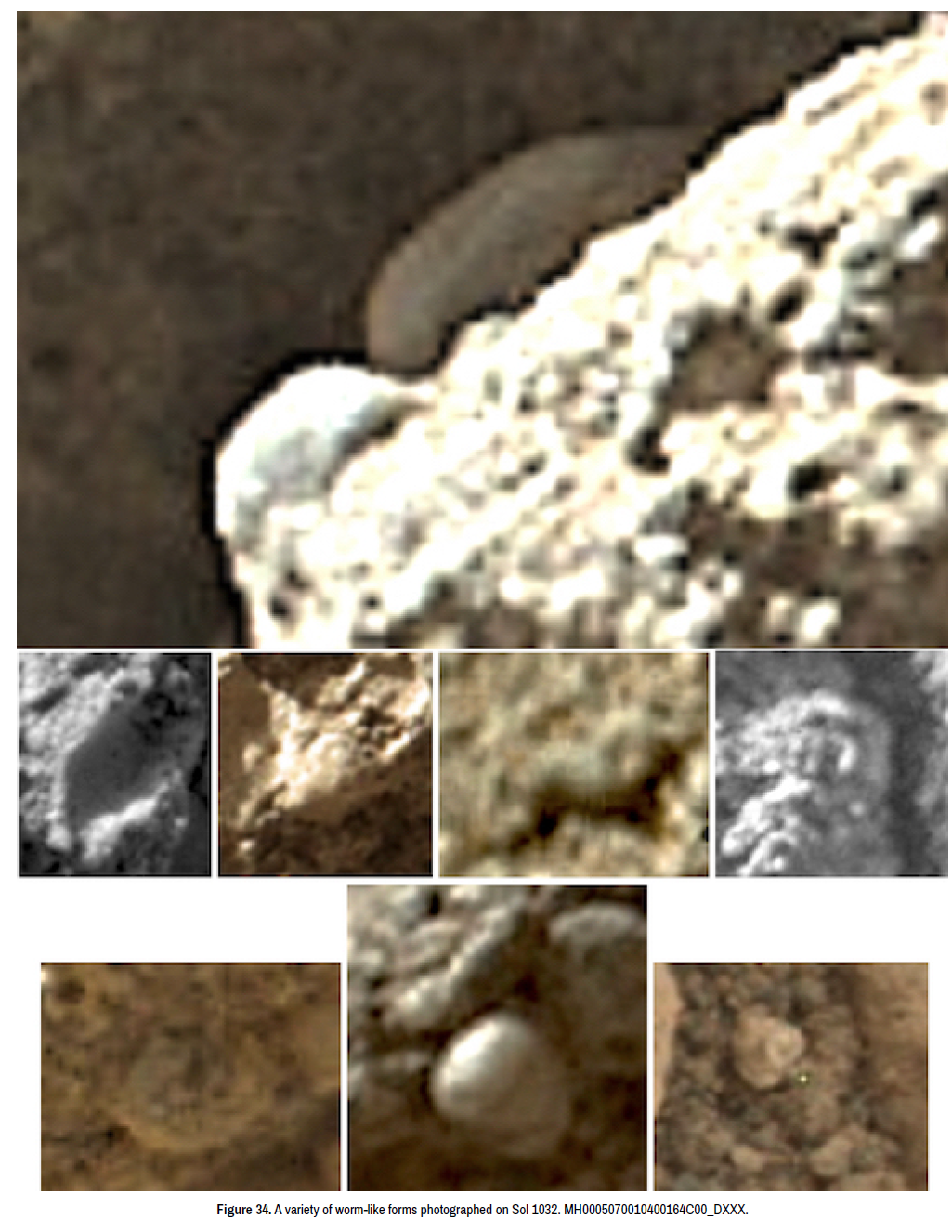Figure 23. Top and bottom right: Segmented worm-like shapes that appear to be mineralized and embedded in a mud-covered coral-like matrix. Sol 869MH0004600020302294C00_DXXX. Bottom left: Sol 1905. These specimens are approximately 1 to 5 mm in length on average. Several of these "worm-like" specimens have an open aperture at one end. However, in comparing Sol 1905 to Sol 869, note: the dimensions are very different and the shape of 1905 is flat, not segmented. The only thing in common is the curvilinear shape. Hence, they may represent two species of “worm” (e.g. annelids vs. nematodes).